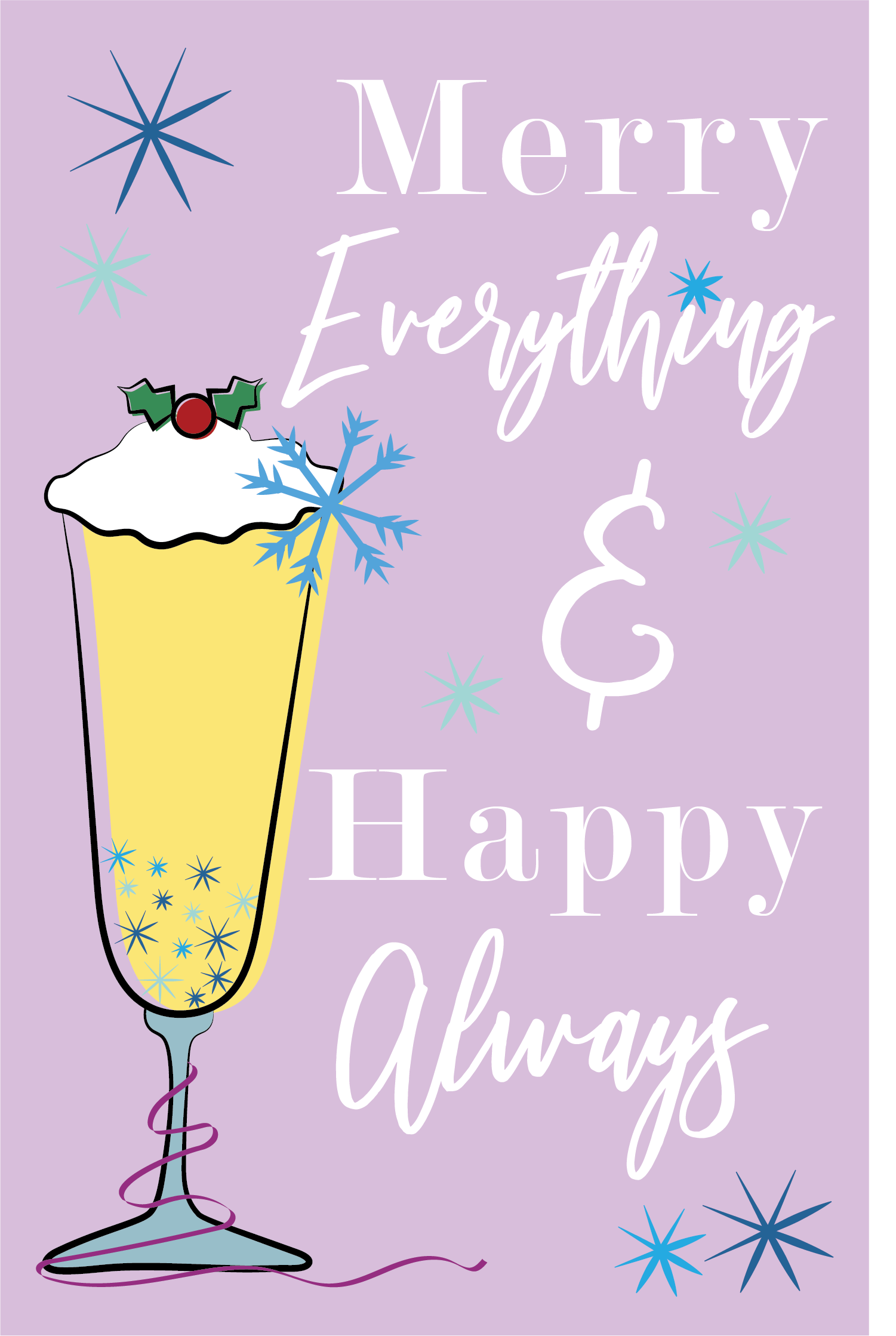 Illustrated front cover of a Holiday card. Style, color palette and typeface choices are inspired by illustrative retro advertisements from the 50s to 60s.